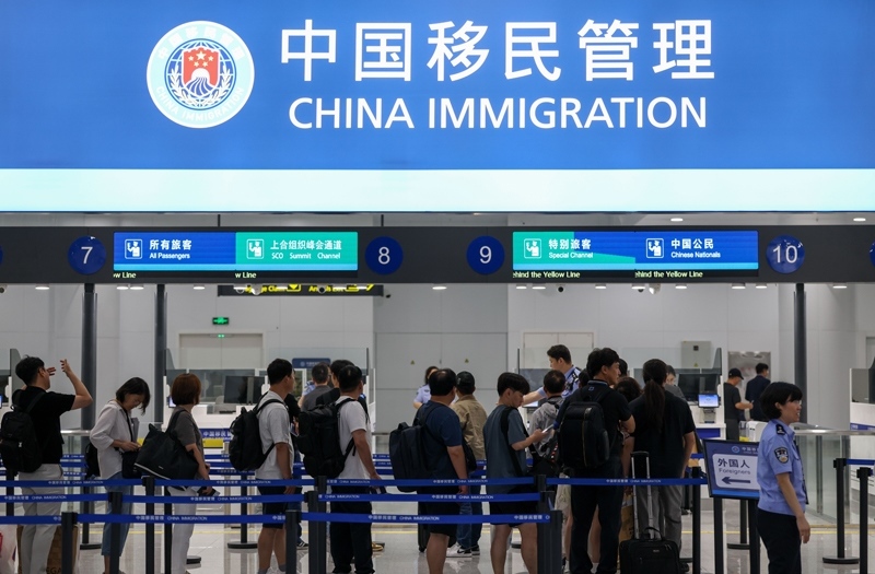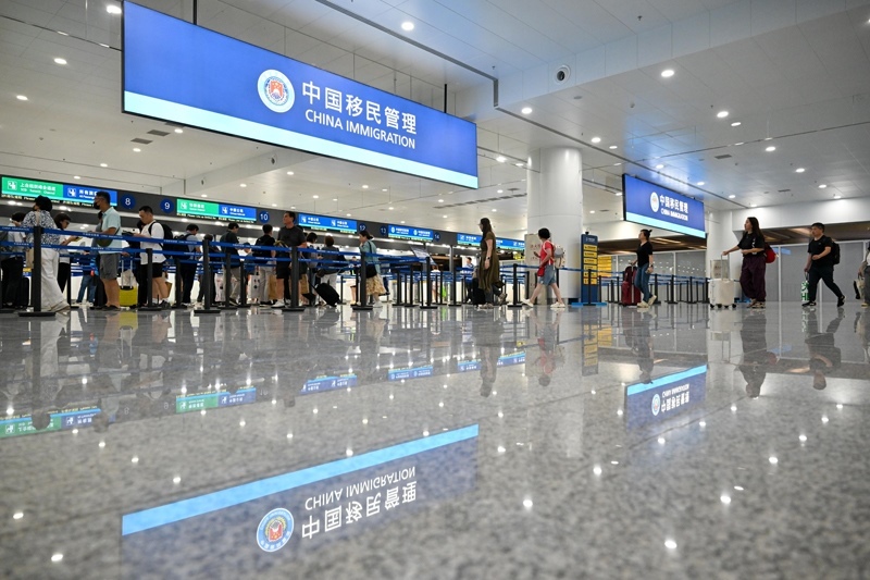 8月27日,在天津?yàn)I海國際機(jī)場T1航站樓,旅客排隊(duì)入境查驗(yàn)。