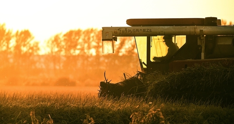 10月3日,農(nóng)戶在北大荒集團(tuán)黑龍江八五六農(nóng)場有限公司第五管理區(qū)搶收水稻(無人機(jī)照片)。
