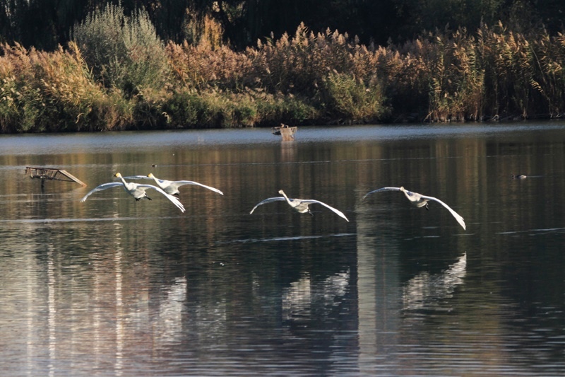 10月17日在甘肅省張掖市國(guó)家濕地公園鶴影湖拍攝的白天鵝。