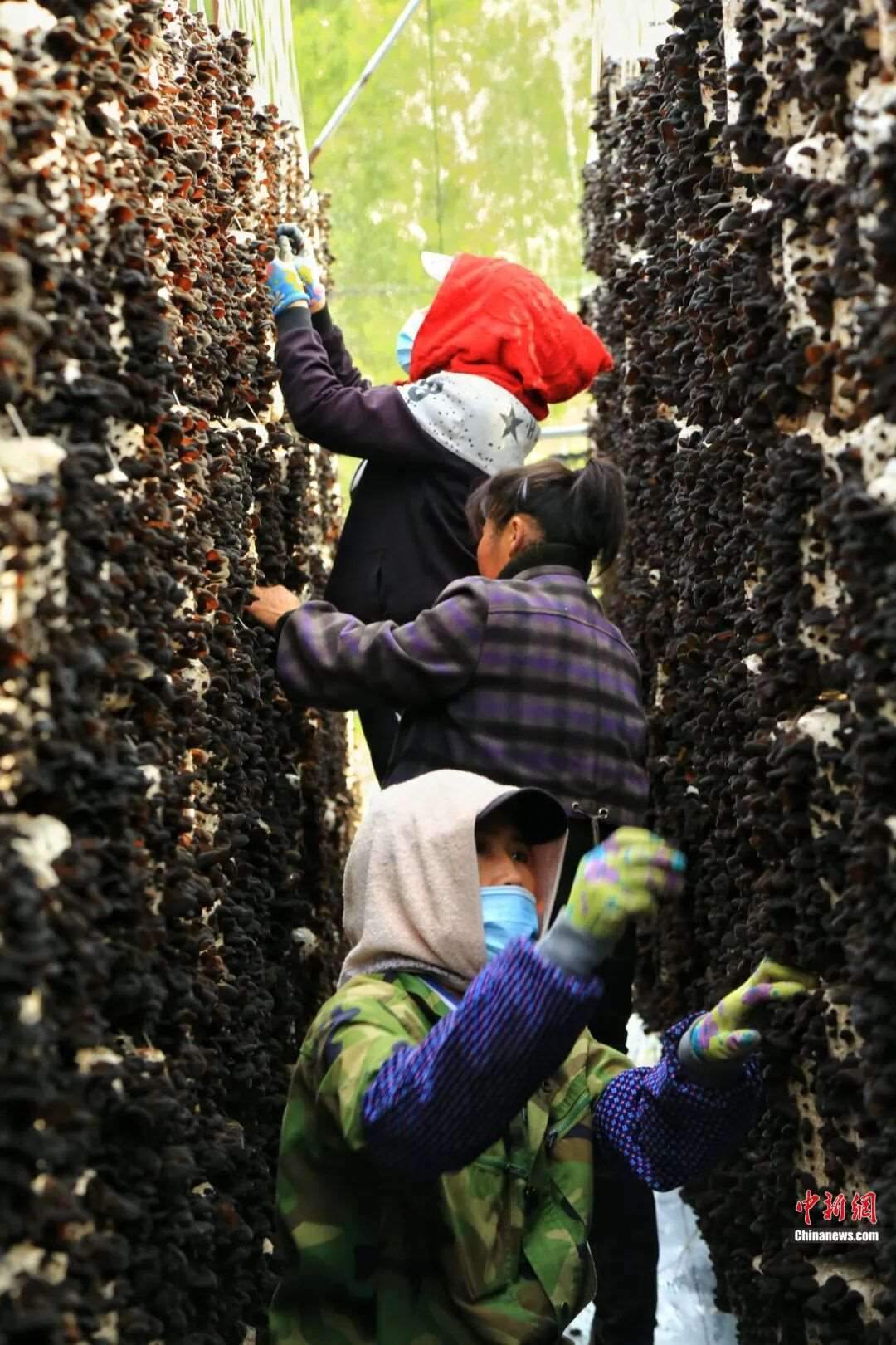 菌農(nóng)們正忙碌地采摘最后一批秋耳