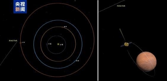 △星際天體阿特拉斯與天問一號火星環(huán)繞器相對位置示意圖(右圖是2025年10月3日相機拍攝時左圖的局部放大)