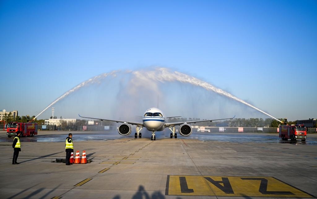 11月9日,國(guó)航CA104航班降落在天津?yàn)I海國(guó)際機(jī)場(chǎng)后通過(guò)“水門(mén)”。新華社記者 趙子碩 攝