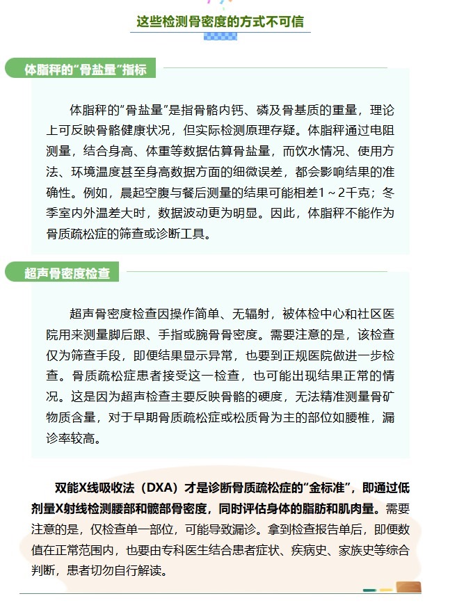 骨骼健康是人體健康的重要組成部分,其評估指標(biāo)不僅包括鈣含量,還涉及骨骼強(qiáng)度等多方面的因素,而骨密度在一定程度上,可以反映骨骼健康狀態(tài)。需要明確的是,并非人人都需要進(jìn)行骨密度檢查。而且,當(dāng)下流行的體脂秤及體檢中常用的超聲骨密度檢查,均不能作為診斷骨質(zhì)疏松癥的依據(jù)。正確認(rèn)識骨密度檢查的適用人群,既能避免醫(yī)療資源浪費(fèi),也能減少不必要的健康焦慮。