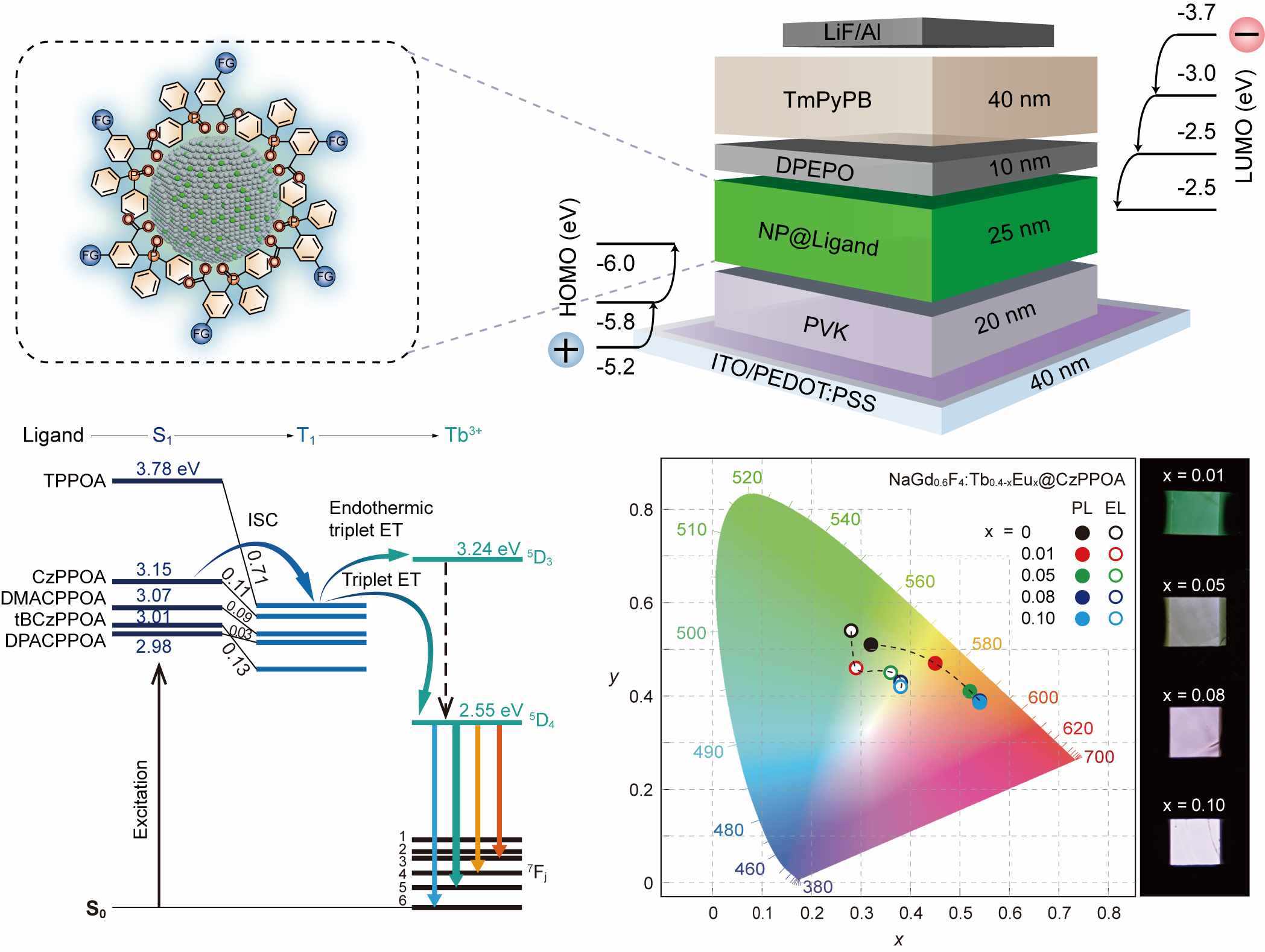 面對這一制約稀土材料邁向高端應用的瓶頸,研究團隊開創(chuàng)性地提出有機半導體敏化策略,以功能化有機配體作為“光電橋梁”,成功將能量精準高效地傳遞給絕緣稀土納米晶,實現(xiàn)了電流驅動下的高效發(fā)光。
