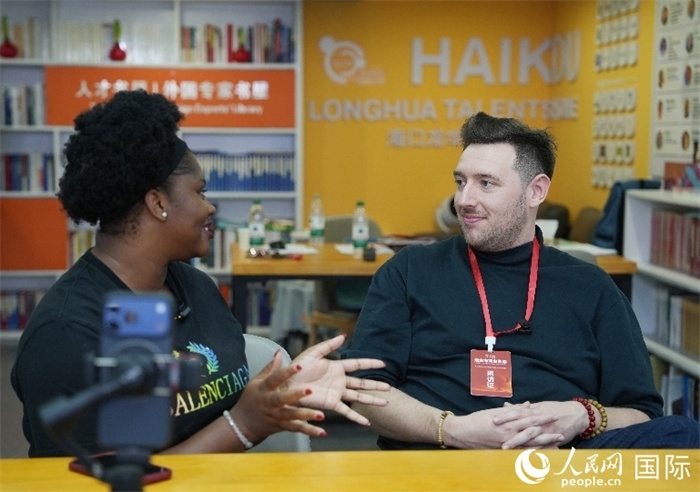 尼日利亞籍創(chuàng)業(yè)者馬爾維斯·烏福馬杜(左一)接受人民網(wǎng)外專柯明可采訪。人民網(wǎng)記者 符武平攝