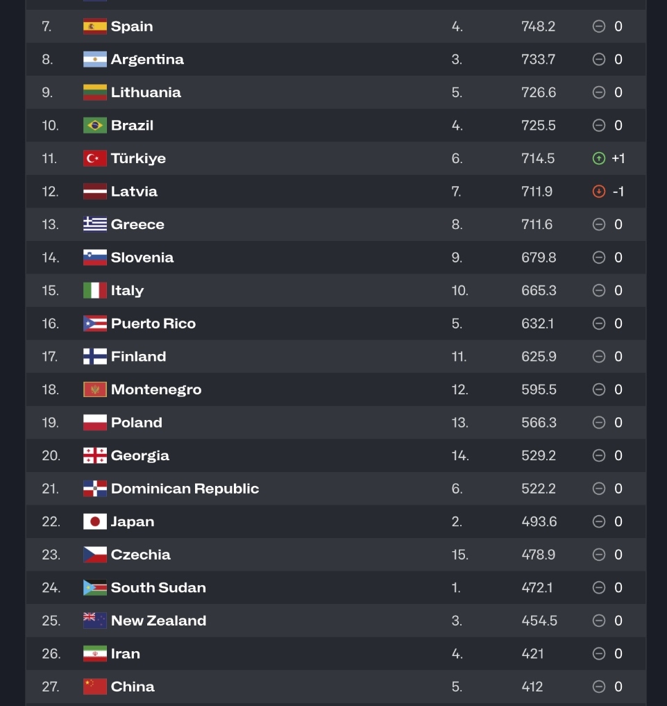 世界男籃前十名依舊為:美國(guó)、德國(guó)、塞爾維亞、法國(guó)、加拿大、澳大利亞、西班牙、阿根廷、立陶宛和巴西。土耳其超過(guò)拉脫維亞升至第11位,拉脫維亞降至第12位。