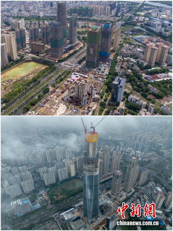 2025年12月18日,海南自由貿(mào)易港正式啟動(dòng)全島封關(guān)。近年來(lái),海南自貿(mào)港建設(shè)在利好政策帶動(dòng)下不斷刷新“自貿(mào)港速度”,一個(gè)個(gè)重大項(xiàng)目、重點(diǎn)園區(qū)拔地而起,直觀呈現(xiàn)海南自貿(mào)港的蓬勃生機(jī)。這里正成為中國(guó)對(duì)外開(kāi)放的新前沿、互利合作的新熱土和推動(dòng)經(jīng)濟(jì)全球化的新引擎。上資料圖為2020年8月21日因故停工的“海南第一高樓”海南中心項(xiàng)目,下資料圖為2025年12月16日海南中心項(xiàng)目順利完成塔樓核心筒結(jié)構(gòu)封頂。(拼版圖,無(wú)人機(jī)照片)