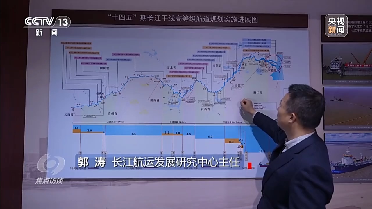 郭濤:十年前,因為局部的堵點(diǎn)卡點(diǎn),航道標(biāo)準(zhǔn)不能統(tǒng)一,水深沒法貫通起來。通過十年的整治和疏浚,水深明顯提升了,可以通航的船舶更大了,物流成本就更低了。