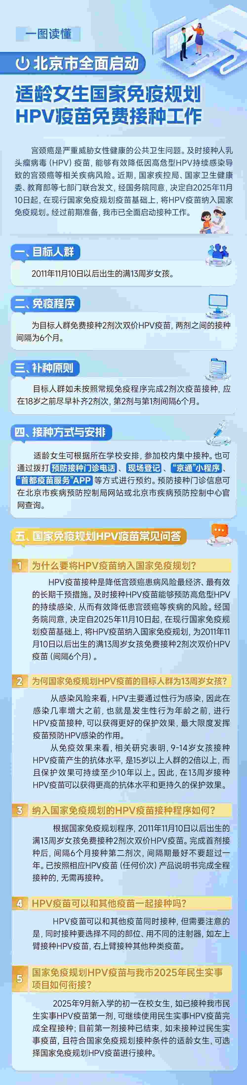 接種工作的目標人群為2011年11月10日以后出生的滿13周歲女孩。北京市將為目標人群免費接種2劑次雙價HPV疫苗,兩劑之間的接種間隔為6個月。目標人群如未按照常規(guī)免疫程序完成2劑次疫苗接種,應在18歲之前盡早補齊2劑次,第2劑與第1劑間隔6個月。