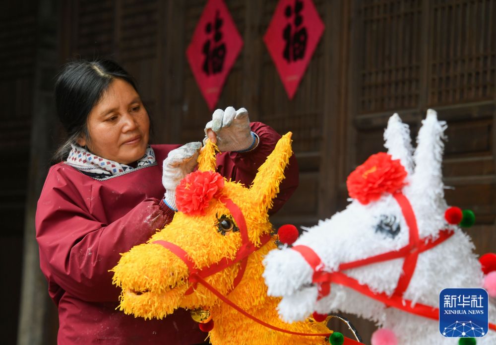 ↑ 1月21日,浙江省金華市浦江縣檀溪鎮(zhèn)潘周家村一古廳堂內(nèi),村民在制作擂馬燈。新華社發(fā)(時(shí)寬兵攝)