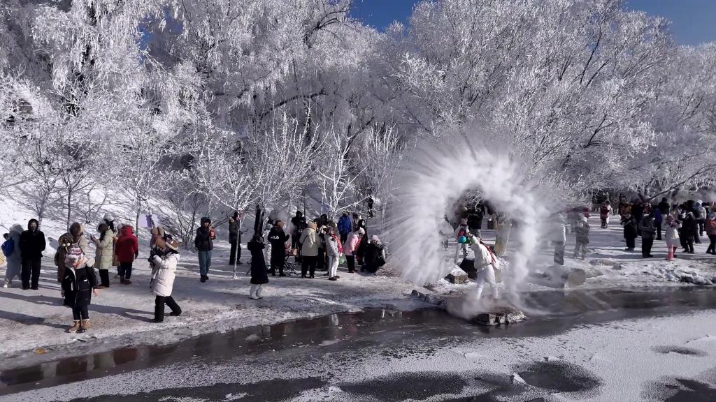 寒冬時節(jié),吉林省吉林市松花江畔?,F(xiàn)“忽如一夜春風來,千樹萬樹梨花開”的霧凇奇景。