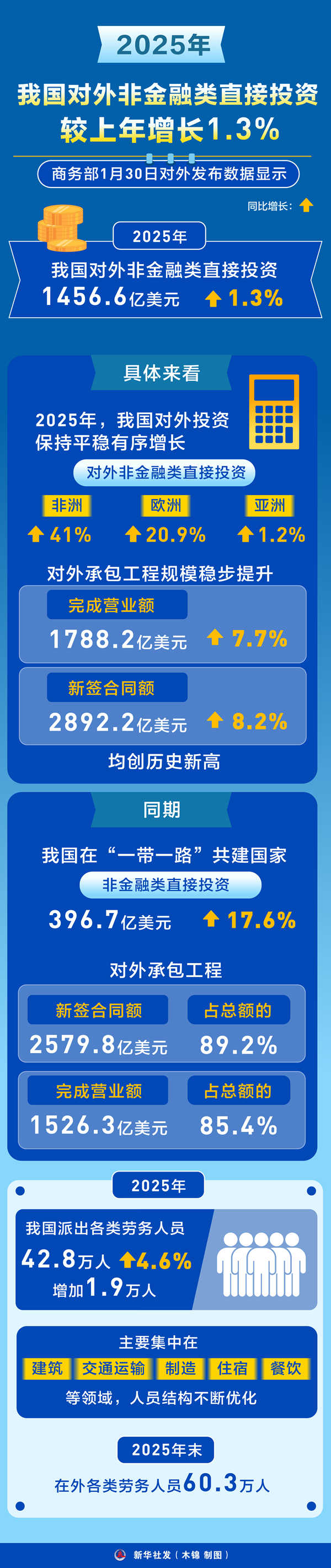 具體來看,2025年,我國(guó)對(duì)外投資保持平穩(wěn)有序增長(zhǎng),對(duì)非洲、歐洲、亞洲非金融類直接投資分別增長(zhǎng)41%、20.9%和1.2%;對(duì)外承包工程規(guī)模穩(wěn)步提升,完成營(yíng)業(yè)額1788.2億美元,較上年增長(zhǎng)7.7%,新簽合同額2892.2億美元,較上年增長(zhǎng)8.2%,均創(chuàng)歷史新高。