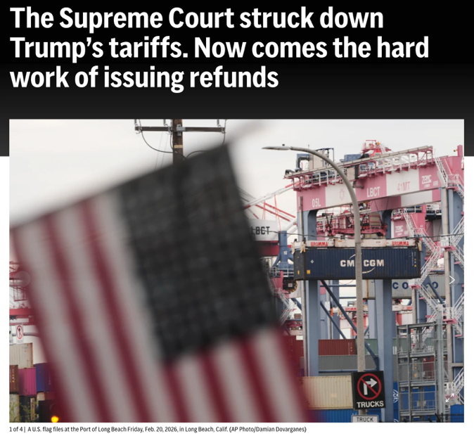 △美聯(lián)社報道,最高法院駁回特朗普的關稅政策后,艱巨的退還稅款任務開始了