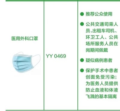 醫(yī)用外科口罩:防護(hù)效果優(yōu)于一次性使用醫(yī)用口罩,推薦公眾包括疑似病例患者、公共交通司乘人員、出租車司機(jī)、環(huán)衛(wèi)工人、公共場(chǎng)所服務(wù)人員在崗期間佩戴。該類型口罩還可保護(hù)手術(shù)中患者創(chuàng)面免受污染,可為醫(yī)務(wù)人員提供防止血液和體液飛濺的基本隔離。(橫列為口罩的圖片+名稱、產(chǎn)品標(biāo)準(zhǔn)、建議應(yīng)用場(chǎng)景。圖片來源:中國(guó)疾控中心)