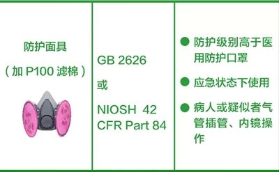 防護(hù)面具(加P100濾棉):防護(hù)級(jí)別高于醫(yī)用防護(hù)口罩,建議用于確診或疑似病例的氣管插管、內(nèi)鏡等操作。(橫列為口罩的圖片+名稱、產(chǎn)品標(biāo)準(zhǔn)、建議應(yīng)用場(chǎng)景。圖片來源:中國(guó)疾控中心)