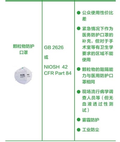 工業(yè)防顆粒物口罩:顆粒物的阻隔能力與醫(yī)用防護(hù)口罩類似,可用于工業(yè)防塵和霧霾防護(hù)。由于該類口罩無血液透過性測(cè)試,不推薦公眾佩戴,也不能用于手術(shù)室等有衛(wèi)生學(xué)要求的區(qū)域。(橫列為口罩的圖片+名稱、產(chǎn)品標(biāo)準(zhǔn)、建議應(yīng)用場(chǎng)景。圖片來源:中國(guó)疾控中心)