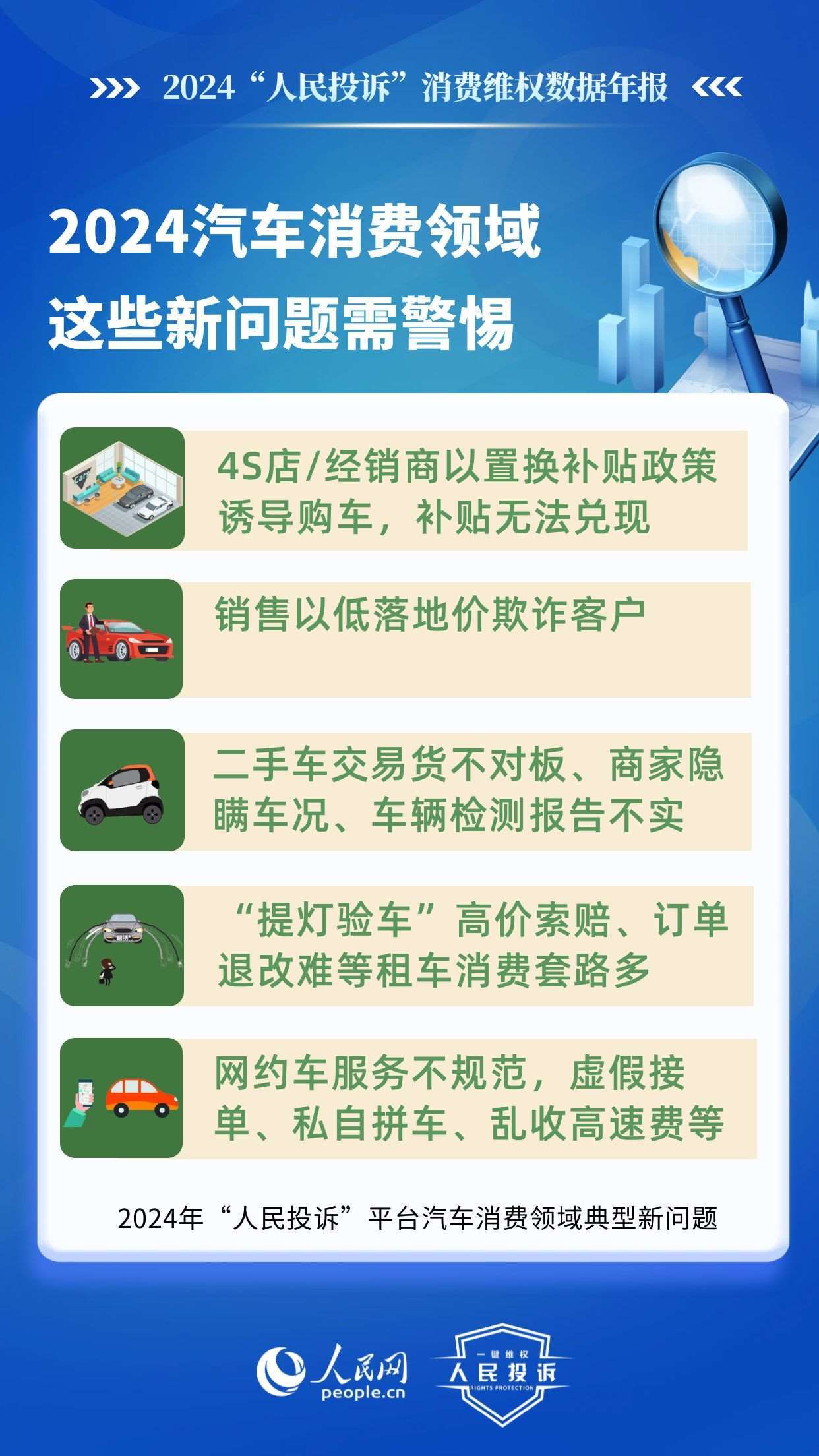 新問題體現(xiàn)在:4S店/經(jīng)銷商以置換補(bǔ)貼政策誘導(dǎo)購(gòu)車,結(jié)果補(bǔ)貼無法兌現(xiàn);銷售以低落地價(jià)欺詐客戶;二手車交易貨不對(duì)板、商家隱瞞車況、平臺(tái)車輛檢測(cè)報(bào)告不實(shí);惡意租“故障車”、“提燈驗(yàn)車”高價(jià)索賠、低價(jià)誘租、訂單退改難等租車消費(fèi)套路多;網(wǎng)約車服務(wù)不規(guī)范,人車不符、虛假接單、私自拼車、亂收高速費(fèi)等。