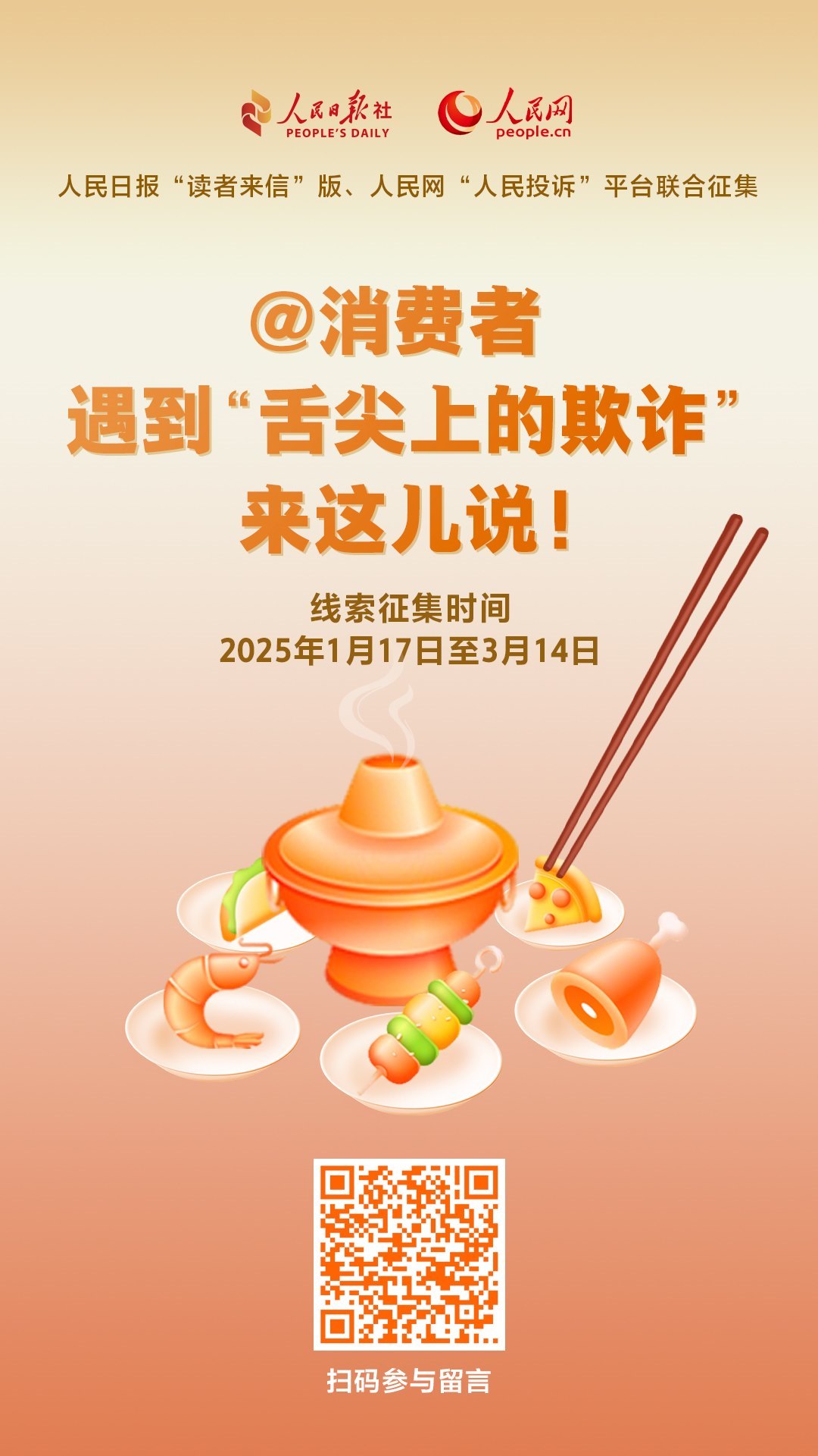 牛肉干里不含牛肉,無糖產(chǎn)品其實含糖,配料表造假、營養(yǎng)成分表不準(zhǔn)確……你遇到過嗎?“以假亂真”“以次充好”為代表的食品欺詐,嚴(yán)重?fù)p害消費者利益,擾亂市場公平競爭秩序。為筑牢食品安全防線,增強消費者信心,即日起,人民日報“讀者來信”版與人民網(wǎng)“人民投訴”平臺聯(lián)合發(fā)起相關(guān)線索征集,歡迎您掃描上方海報二維碼進(jìn)入征集頁面留言或提供調(diào)查線索至人民日報“讀者來信”版(郵箱:dzlx@peopledaily.cn 傳真:010-65368495)。線索征集時間截至2025年3月14日。