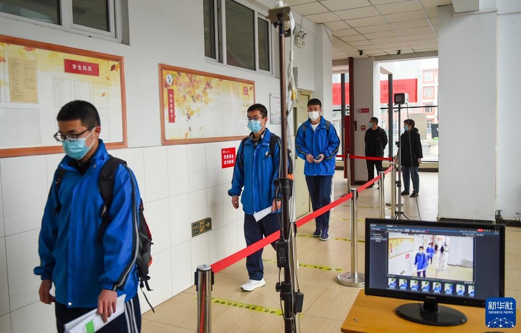 4月1日,高三年級學(xué)生走進呼和浩特市鐵路第二中學(xué)教學(xué)樓,體溫檢測設(shè)備查驗學(xué)生體溫。