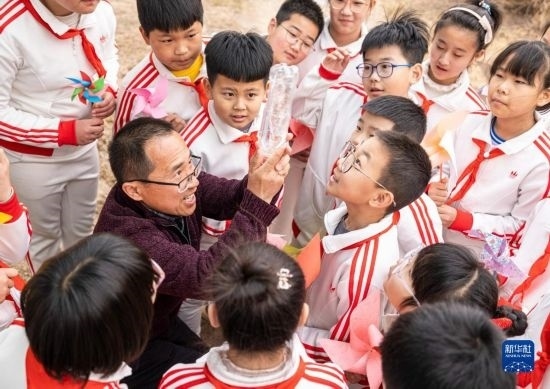 3月23日,在河北省唐山市豐南區(qū)氣象科普公園,工作人員和學(xué)生一起互動游戲。