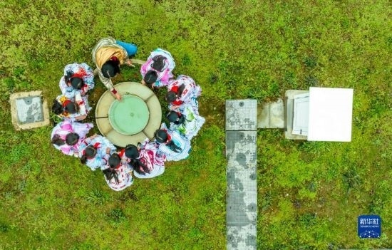 3月23日,學(xué)生在貴州省黔西市氣象局綜合氣象觀測站觀看大型蒸發(fā)皿(無人機照片)。