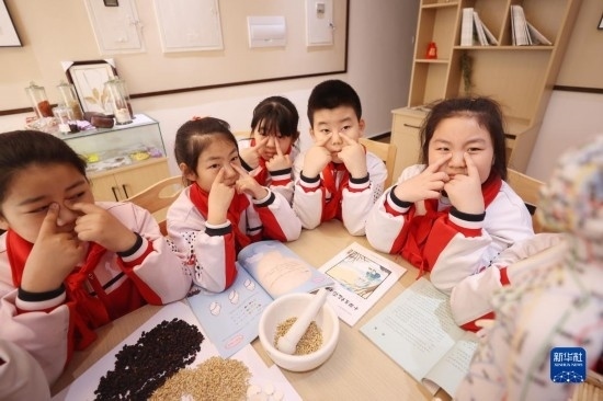 3月24日,河北省廊坊市第五小學(xué)學(xué)生在該校國醫(yī)館內(nèi)跟隨老師識別中藥。