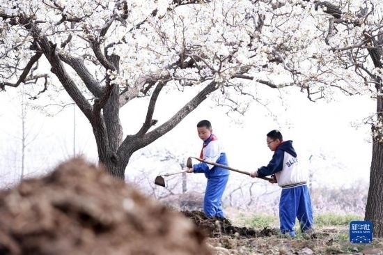 3月28日,內(nèi)丘縣大都城小學(xué)學(xué)生在梨園鋤草。