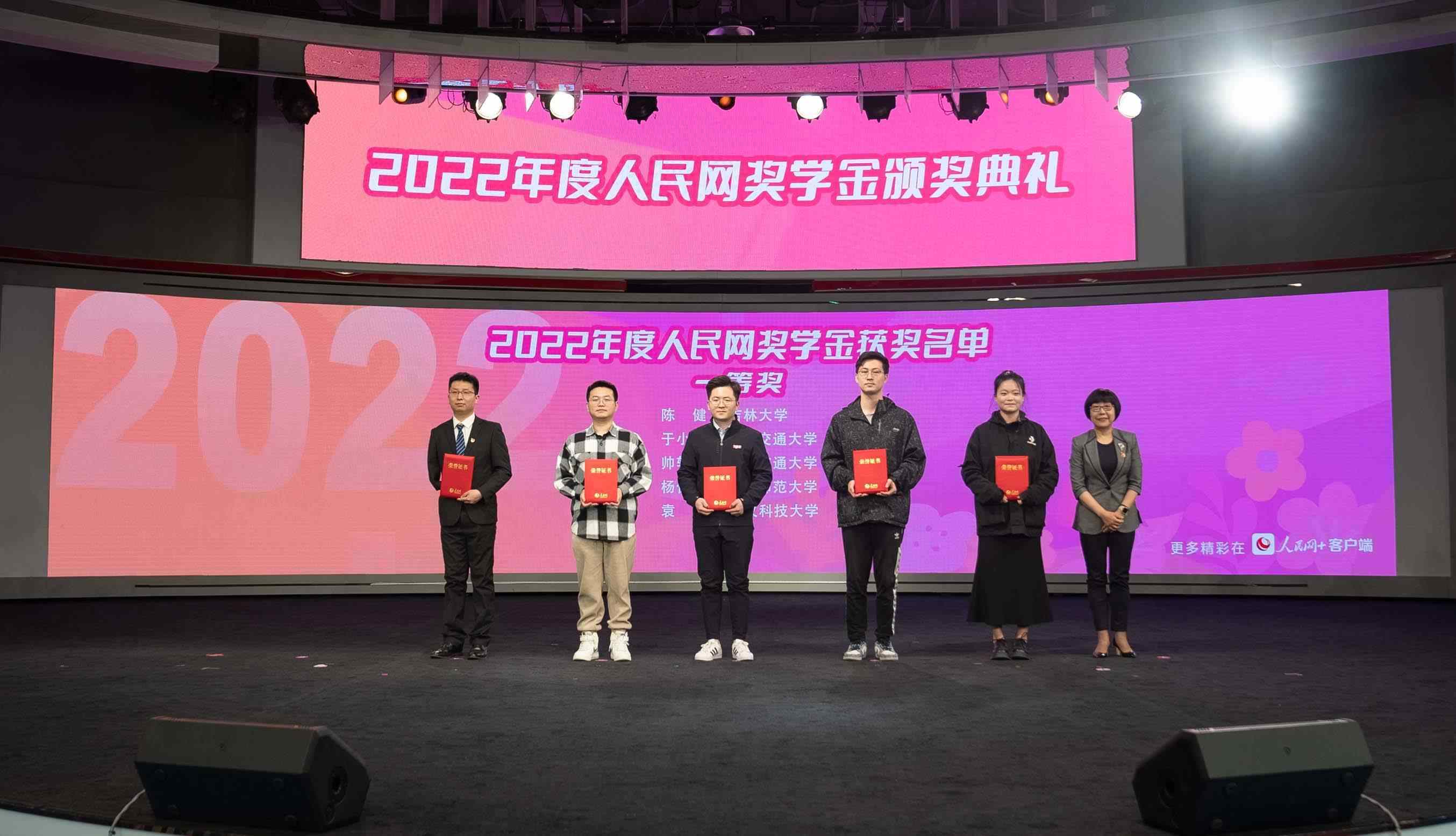 人民網(wǎng)黨委委員、監(jiān)事會主席、人民網(wǎng)研究院院長唐維紅(右一)為2022 年度人民網(wǎng)獎學(xué)金一等獎獲獎學(xué)生頒獎。實習(xí)生韓華良 攝