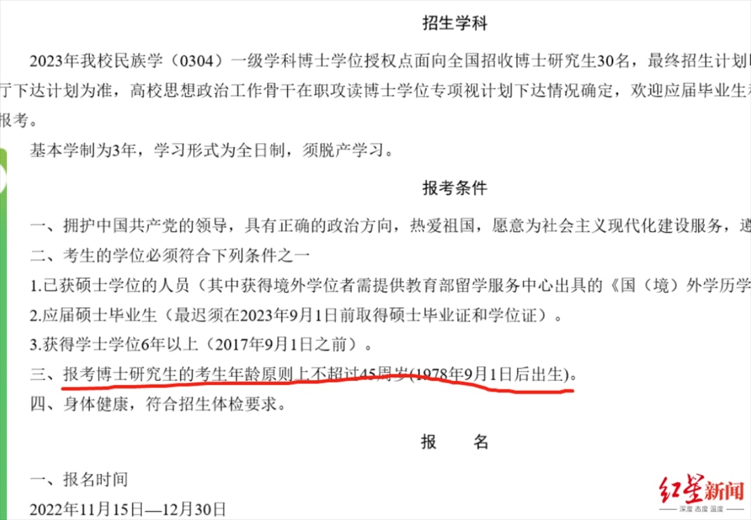 而根據(jù)《青海民族大學(xué)2023年民族學(xué)博士研究生招生簡章》,報考博士研究生的考生年齡原則上不超過45周歲(1978年9月1日后出生)。資料顯示,阿進錄為1973年出生。對于網(wǎng)友提到的“年齡不符合報考條件”,上述工作人員表示:“他資格審查是通過的?!?/strong>