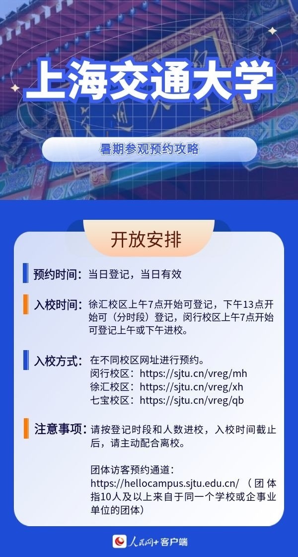 人民網(wǎng)北京7月19日電 暑假來臨,帶孩子參觀高校,感受學(xué)校人文歷史底蘊以及濃厚的學(xué)術(shù)氛圍,已經(jīng)成為很多家長的選擇。近日,全國多所高校開放校園,接受公眾參觀。那么如何預(yù)約進(jìn)校?有什么注意事項?人民網(wǎng)特別整理了部分高校的參觀預(yù)約攻略,一起來看。(郝孟佳、實習(xí)生趙雪祺)