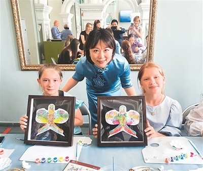 不久后的9月,“東方雅韻——中國文化藝術(shù)展”2.0版本及“天涯共此時(shí)”中秋文化體驗(yàn)活動在西班牙馬德里中國文化中心舉辦。天津博物館首次將體驗(yàn)工坊帶進(jìn)馬德里社區(qū),當(dāng)?shù)貎和跉g聲笑語中沉浸式感受中華傳統(tǒng)技藝,一位當(dāng)?shù)嘏W⒌赜猛赜」ぞ邚?fù)刻楊柳青木版年畫,她指尖起落間,寓意吉祥的“連年有余”圖案逐漸清晰。工坊結(jié)束后,大家拿著自己拓印的團(tuán)扇、親手捏制的中秋兔子與老師合影,還放飛了自己動手著色的迷你風(fēng)箏。