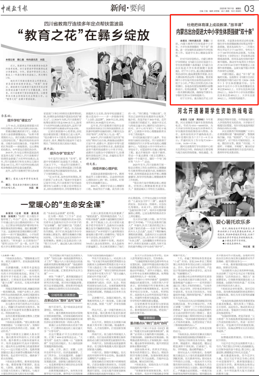 2025年7月11日,《中國教育報》第3版刊發(fā)題為《杜絕把體育課上成說教課、“放羊課”內蒙古出臺促進大中小學生體質強健“雙十條”》的文章,報道了內蒙古教育廳印發(fā)促進中小學生、大學生體質強健的“雙十條”措施,進一步加強和改進新時代學校體育工作,促進學生身心健康全面發(fā)展。