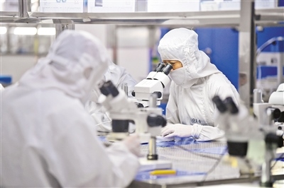 工人在包頭江馨微電機(jī)科技有限公司數(shù)字化百級(jí)無塵車間趕制配套5G手機(jī)產(chǎn)品的音圈馬達(dá)。