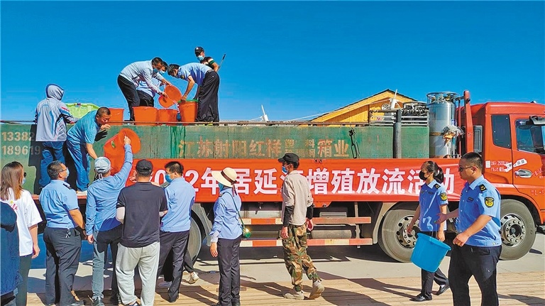 額濟納旗2022年居延海漁業(yè)資源增殖放流活動在風光秀麗、生態(tài)優(yōu)美的居延海畔東歸碼頭啟動,經公證機關公證,同意現(xiàn)場向居延海放流草魚魚苗100萬尾,花白鰱89萬尾?;顒蝇F(xiàn)場,前來參與活動的居民拿著水桶,把一條條活蹦亂跳的魚苗放生到居延海中。據了解,該旗從2008年以來累計放流的魚苗數量達到了900余萬尾。
