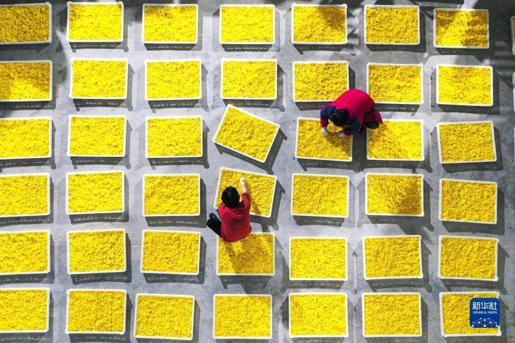 10月20日,村民在貴州省貴定縣云霧鎮(zhèn)一家菊花加工車間攤晾金絲皇菊。新華社記者 楊文斌 攝
