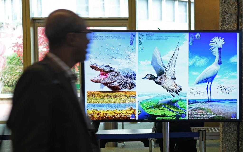2022年11月5日,在瑞士日內(nèi)瓦,與會(huì)嘉賓在《濕地公約》第十四屆締約方大會(huì)日內(nèi)瓦會(huì)場(chǎng)中國(guó)展區(qū)參觀。新華社記者連漪攝