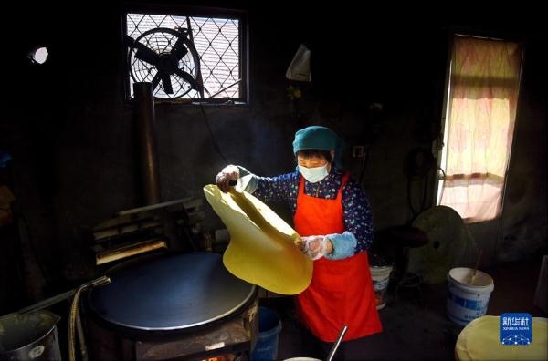 12月6日,山東省淄博市沂源縣石橋鎮(zhèn)石樓村的村民在加工粉皮。新華社發(fā)(趙東山 攝)