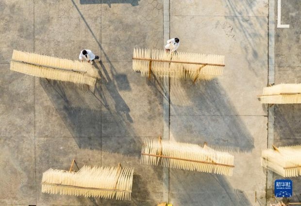 12月12日,在竹塘社區(qū)掛面合作社的掛面車間,工人在將掛面上架晾曬(無人機照片)。新華社發(fā)(阮雪楓 攝)