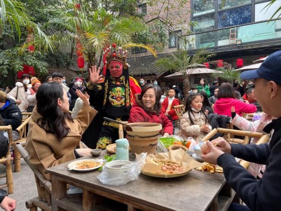 春節(jié)期間,重慶市渝中區(qū)山城巷中,“山城壩壩”茶館的院壩內(nèi)坐滿了客人。人們一邊圍爐煮茶,一邊欣賞臺上的傳統(tǒng)藝術(shù)表演,川劇變臉演員剎那間切換臉譜,贏得滿堂喝彩。老板舒蓉?zé)崆檎泻糁腿耍瑢⒉杷?、點心端到桌上,忙得不亦樂乎?!敖衲甏汗?jié)的客流量遠超預(yù)期,營業(yè)額是去年同期的七八倍?!?/p>