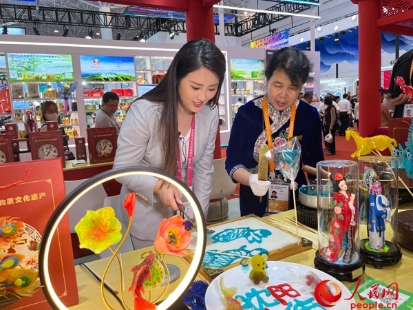 “我們的糖人制作技藝興于清朝道光年間,技法分為吹、塑、畫。結(jié)合消費(fèi)新需求,我們推出了一些新產(chǎn)品,很受年輕人喜歡。在消博會上,通過展示糖人技藝,讓更多的消費(fèi)者了解傳統(tǒng)文化,喜歡上我們的作品。”沈陽李氏糖人制作技藝第五代傳承人李鳳艷表示。