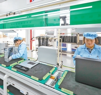 工人在畢節(jié)一家計(jì)算機(jī)生產(chǎn)企業(yè)產(chǎn)線上組裝產(chǎn)品。陳 曦攝(人民視覺)