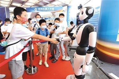 在北京亦創(chuàng)國際會展中心舉行的2022世界機器人博覽會上,小觀眾在與智能服務機器人握手。陳曉根攝(人民視覺)