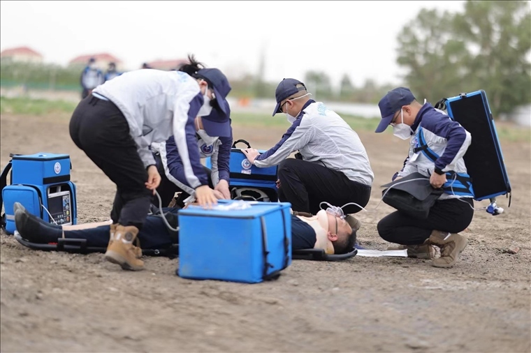 醫(yī)學(xué)急救“白金10分鐘、黃金1小時”,針對可能出現(xiàn)的飛船返回偏離落點,落在沙漠、山地、湖泊,搜救直升機(jī)無法降落,車輛無法進(jìn)入的情況,為快速到達(dá)著陸地點,醫(yī)療救護(hù)隊員每天隨身攜帶艙前急救設(shè)備堅持訓(xùn)練六七個小時,負(fù)重在沙漠、山地中奔跑,爭取最短時間展開緊急救治。夏日戈壁驕陽似火,風(fēng)沙彌漫,訓(xùn)練一天下來,隊員們耳朵眼里都是沙土,臉上脖子全是泥印,一個個都成了泥人。茫茫大草原記錄了神舟載人飛行任務(wù)醫(yī)療隊員們一次次醫(yī)療救護(hù)空地協(xié)同演練、全域協(xié)同演練的身影……