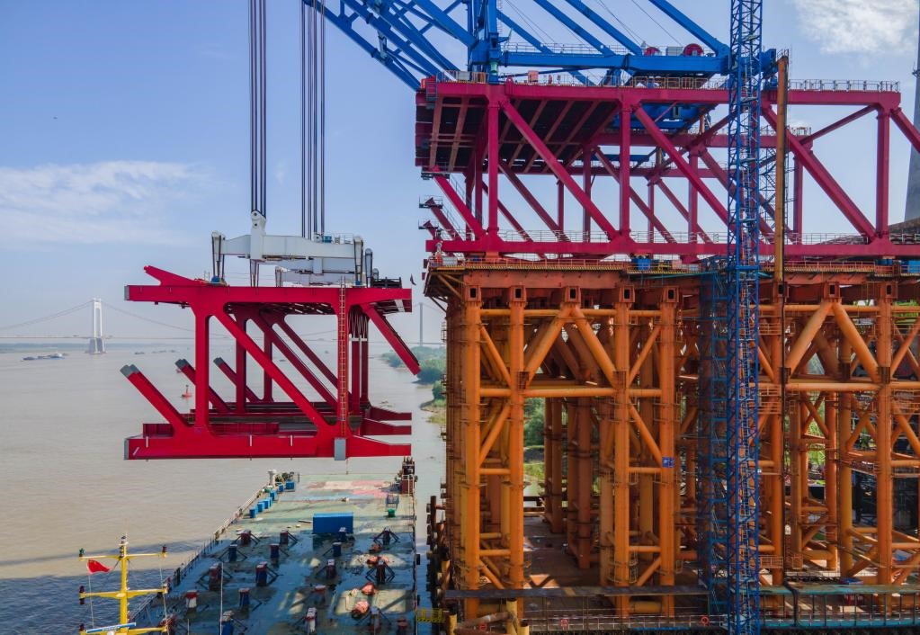 5月28日,馬鞍山長江公鐵大橋正在進行主汊航道橋南側首節(jié)段鋼桁梁吊裝(無人機照片)。新華社發(fā)(羅繼勝 攝)