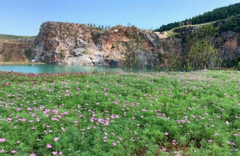 靈山生態(tài)文化旅游區(qū)已打造出繽紛的山林景觀。景區(qū)內(nèi),金色梯田美不勝收,拾階而上,高山草甸順著山勢(shì)起伏;一棵“孤獨(dú)的樹(shù)”矗立山巔,俯瞰遠(yuǎn)處的油菜花海、采礦舊址;穿越千株櫻園、桃林蜿蜒直達(dá)谷底,“礦坑花園”已成為絕佳的拍照打卡地。