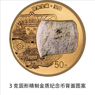 3克圓形金質(zhì)紀念幣背面圖案為玉鉞造型,襯以良渚文化相關紋飾,并刊“國家寶藏·玉鉞”字樣及面額。