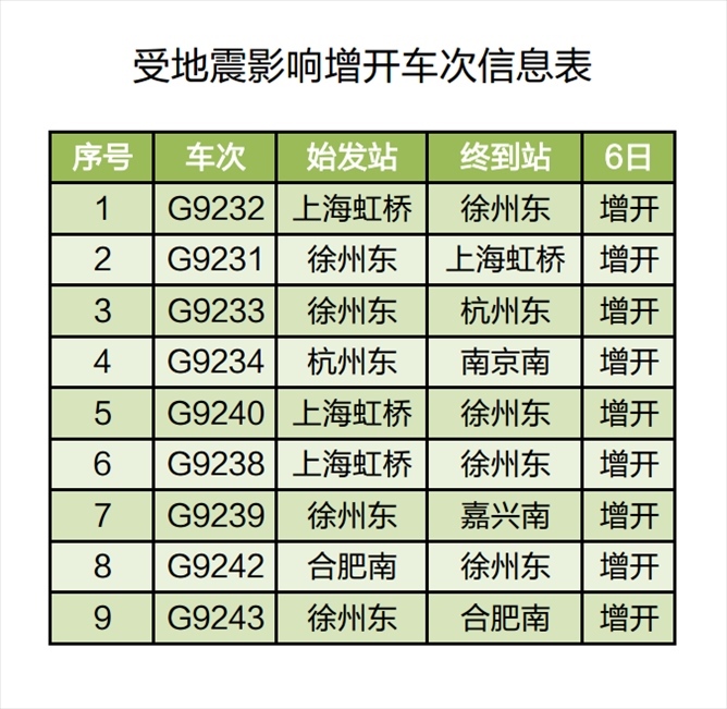人民網(wǎng)北京8月6日電 (記者王連香)記者從中國(guó)鐵路上海局集團(tuán)有限公司獲悉,受8月6日山東省德州市平原縣發(fā)生5.5級(jí)地震影響,為確保列車(chē)運(yùn)行安全,鐵路部門(mén)計(jì)劃對(duì)途經(jīng)京滬高鐵部分列車(chē)采取限速、停運(yùn)等措施;同時(shí),根據(jù)旅客出行需要,計(jì)劃增開(kāi)途經(jīng)京滬高鐵長(zhǎng)三角管內(nèi)區(qū)段部分列車(chē),滿足管內(nèi)旅客出行需要。截至當(dāng)日11時(shí)30分,計(jì)劃停運(yùn)92趟列車(chē)、增開(kāi)9趟列車(chē)。