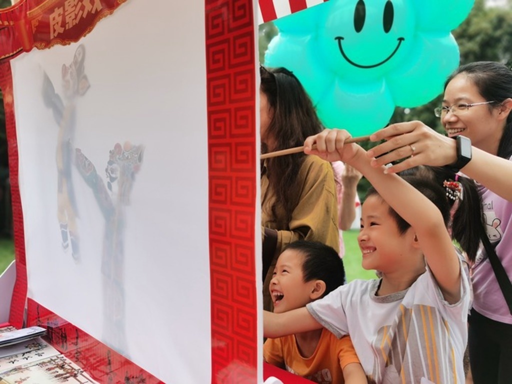 在上海桂林公園舉辦的“唐韻中秋”活動(dòng)上,孩童體驗(yàn)皮影戲。 新華社記者 陳愛(ài)平 攝