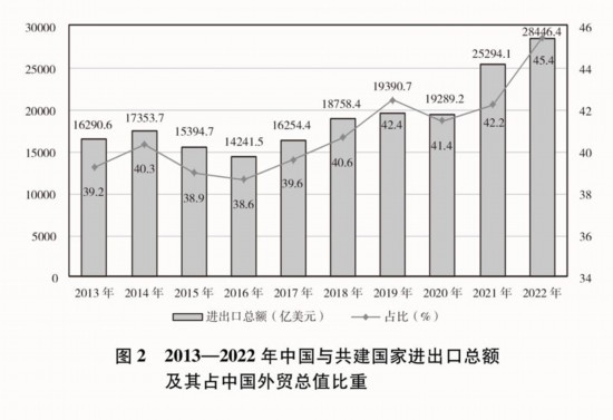 貿易投資規(guī)模穩(wěn)步擴大。2013-2022年,中國與共建國家進出口總額累計19.1萬億美元,年均增長6.4%;與共建國家雙向投資累計超過3800億美元,其中中國對外直接投資超過2400億美元;中國在共建國家承包工程新簽合同額、完成營業(yè)額累計分別達到2萬億美元、1.3萬億美元。2022年,中國與共建國家進出口總額近2.9萬億美元,占同期中國外貿總值的45.4%,較2013年提高了6.2個百分點;中國民營企業(yè)對共建國家進出口總額超過1.5萬億美元,占同期中國與共建國家進出口總額的53.7%。