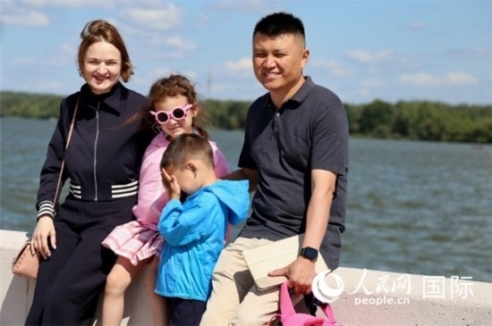 邢亮與妻子娜斯佳還有孩子們在湖邊散步。人民網(wǎng)記者 朱虹攝